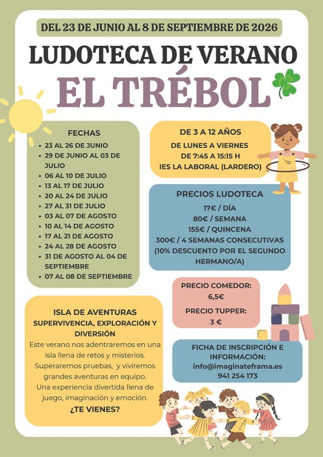 Ludoteca de verano el Trébol Días: del 23 de junio al 8 de septiembre Niños y niñas de 3 a 12 años Horario de lunes a viernes: de 7:45 a 15:15 h. Lugar: IES La Laboral (Lardero) Precios: 1 día 17€; Semana 80€; Quincena155€ 4 semanas consecutivas 300€ Comedor 6,50€, tupper 3,00€ 10% de descuento…