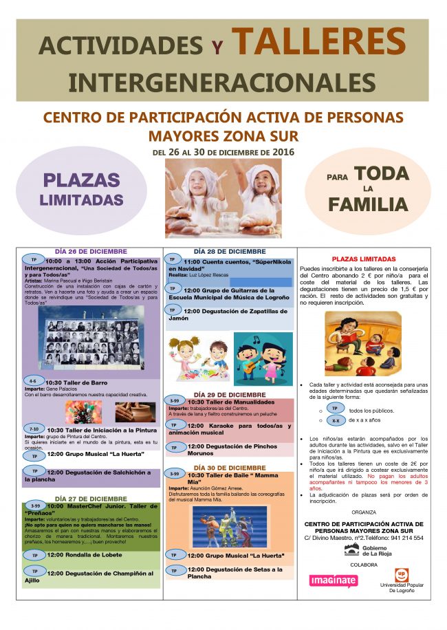 Actividades y Talleres Intergeneracionales 2016 El Centro de Participación Activa de Personas Mayores Zona Sur organiza estas Actividades y Talleres Intergeneracionales para toda la familia en colaboración con Imagínate Frama y la Universidad Popular de Logroño. Estos talleres tendrán lugar en Logroño del 26 al 30 de diciembre de 2016. Podéis inscribiros a los talleres en la…