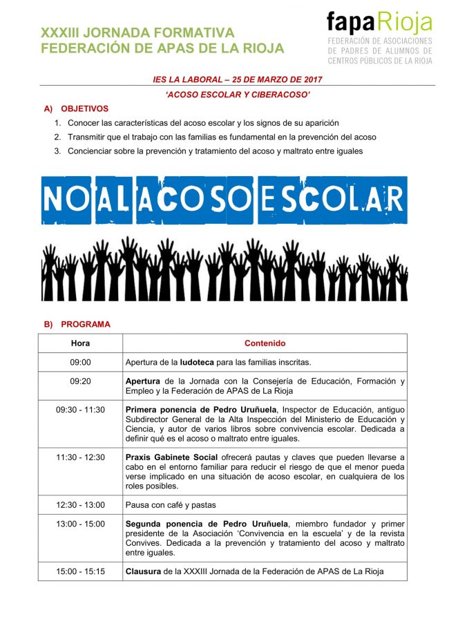 Jornadas Formativas de la Federación de APS de La Rioja para tratar el acoso escolar y el ciberacoso.