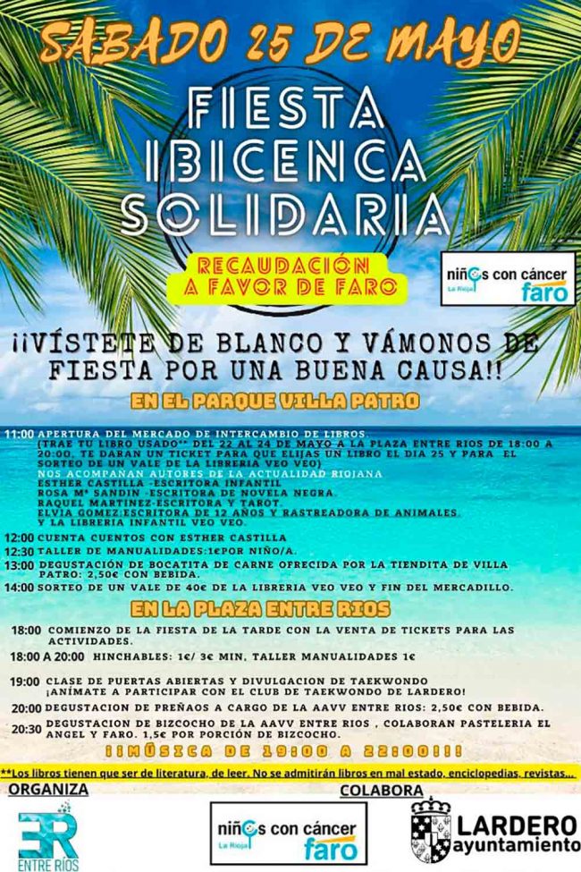 Fiesta Ibicenca Solidaria No te pierdas el 25 de mayo la Fiesta Ibicenca Solidaria con recaudación a favor de Faro. El objetivo de la feria es recaudar todos los beneficios posibles para la asociación Faro de niños con cáncer de La Rioja. Imagínate colabora en la organización con las degustaciones, la difusión, DJ, presentador… ¡No…
