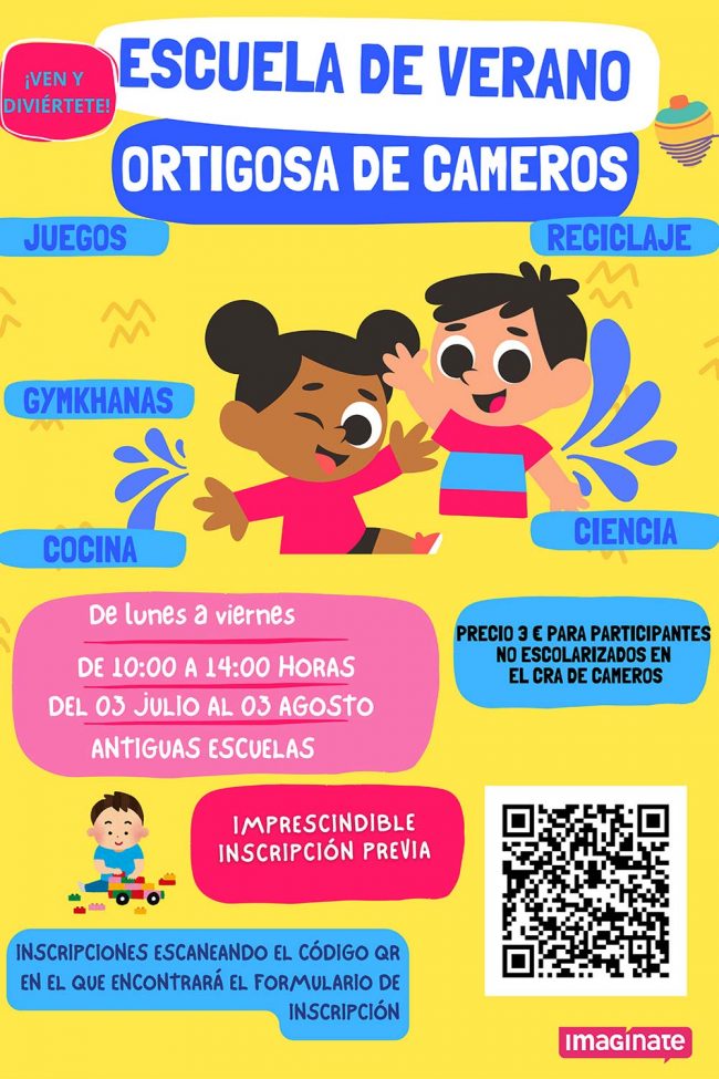 Escuela de Verano en Ortigosa de Cameros Fecha: del 3 de julio al 3 de agosto de 2024. Horario: de lunes a viernes, de 10:00 a 14:00 h. Lugar: antiguas escuelas Precio: 3€ para participantes no escolarizados en CRA de Cameros Imprescindible inscripción previa.