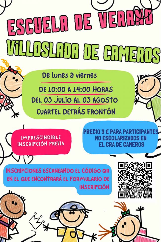 Escuela de Verano en Villoslada de Cameros Fecha: del 3 de julio al 3 de agosto de 2024. Horario: de lunes a viernes, de 10:00 a 14:00 h. Lugar: cuartel detrás del frontón Precio: 3€ para participantes no escolarizados en CRA de Cameros Imprescindible inscripción previa.