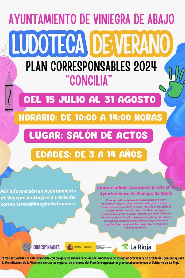 Ludoteca de veranoAyuntamiento de Viniegra de AbajoPlan corresponsables 2024 Fecha: del 15 de julio al 31 de agosto de 2024. Horario: de 10:00 a 14:00 h. Lugar: Salón de actos. Edades: de 3 a 14 años. Imprescindible inscripción previa en el Ayuntamiento de Viniegra de Abajo.