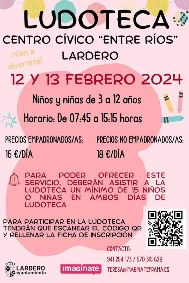Ludoteca 12 y 13 de febrero en el Centro Cívico «Entre Ríos« Lardero Fecha:12 y 13 de febrero de 2024. Horario: de 7:45 a 15:15 h. Lugar: Centro Cívico «Entre Ríos», Lardero Para niños y niñas de edades comprendidas entre 3 y 12 años. Precios empadronados/as: 16€ al día. Precios no empadronados/as: 18€ al día.