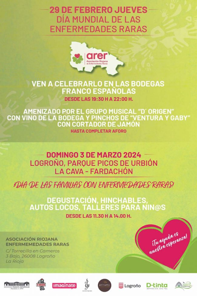 Día Mundial de las enfermedades rarasVen a celebrarlo en las Bodegas Franco Españolas el jueves 29 de febreroAmenizado por el grupo musical «D'Origen« con vino de la bodega y pinchos de Ventura y Gaby con cortador de jamón Fechas: jueves 29 de febrero de 2024 desde 19:30 hasta las 22:00 h. Lugar: Bodegas Franco Españolas.…