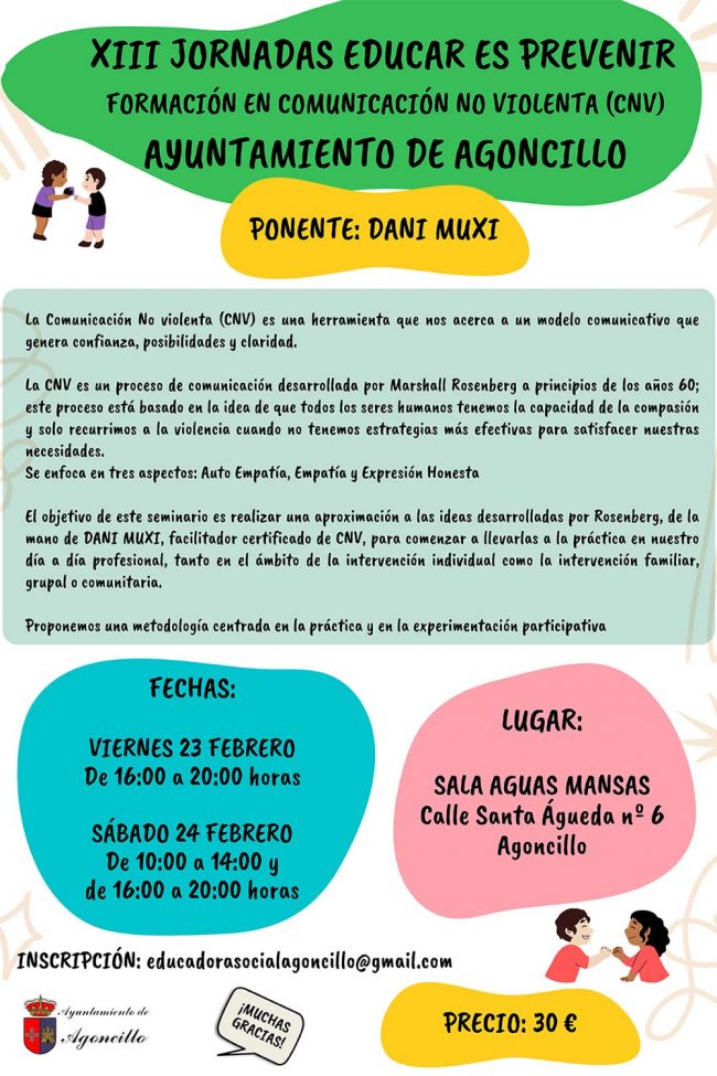 XIII Jornadas educar es prevenirFormación en comunicación no violenta (cnv). Ayuntamiento de Agoncillo.Ponente: Dani Muxi Fechas: viernes 23 de febrero de 2024 de 16:00 a 20:00 h. sábado 24 de febrero de 10:00 a 14:00h. y de 16:00 a 20:00h. Lugar: Sala Aguas Mansas, c/ Santa Águeda nº 6. Agoncillo. Precio: 30€. Inscripción: educadorasocialagoncillo@gmail.com