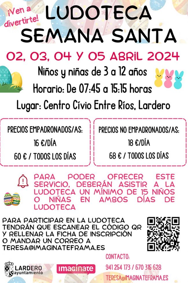Ludoteca Semana Santa «Entre Ríos« Fecha: días 2, 3, 4 y 5 de abril de 2024. Horario: de 7:45 a 15:15 h. Lugar: Centro Cívico «Entre Ríos», Plaza Entre Ríos de Lardero. Edades: de 3 a 12 años. Precio empadronados: 16€ al día. 60€ todos los días. Precio No empadronados: 18€ al día. 68€ todos…
