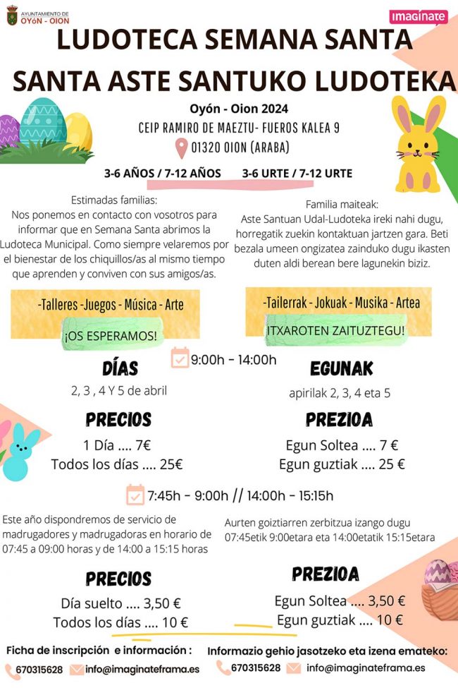 Ludoteca Semana Santa Oyón / Oion 2024 Fecha: días 2, 3, 4 y 5 de abril de 2024. Horario: de 9:00 a 14:00 h. Lugar: CEIP Ramiro de Maeztu, C/ Fueros nº9, Oyón / Oion . Edades: de 3 a 6 años y de 7 a 12 años. Precio 1 día: 7€ . Precio todos…
