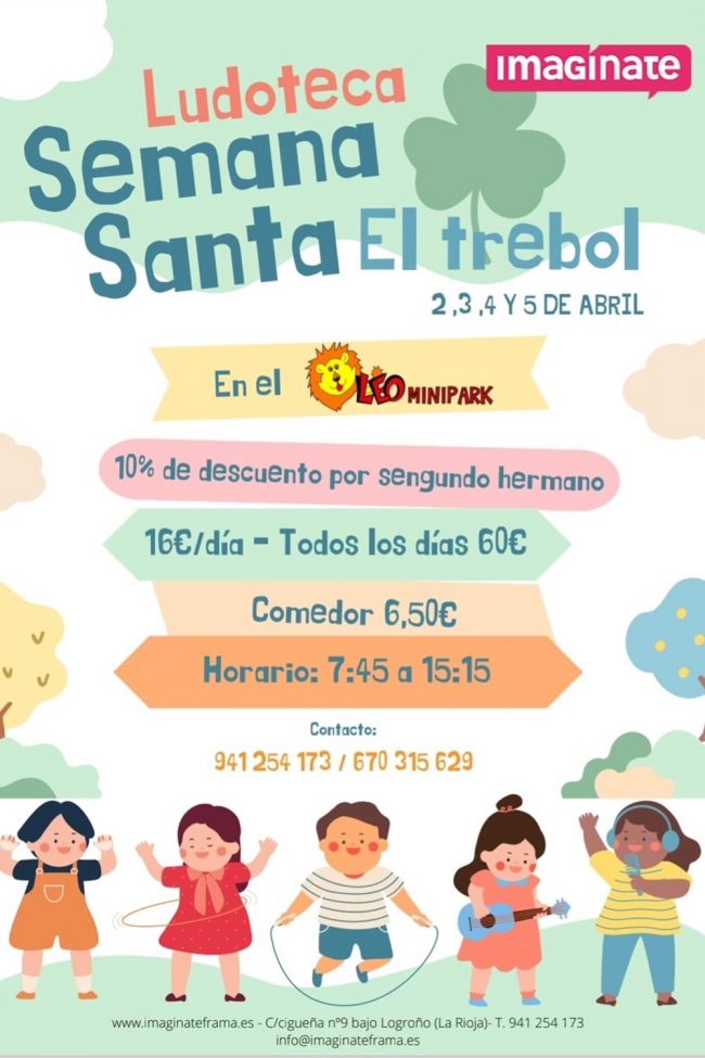 Ludoteca Semana Santa El Trébol Fecha: días 2, 3, 4 y 5 de abril de 2024. Horario: de 7:45 a 15:15 h. Lugar: Minipark Leo, C/ Oviedo, 22, Logroño (La Rioja) Precio: 16€ al día. Precio todos los días: 60€. 10% descuento por segundo hermano. Comedor: 6,50€ al día