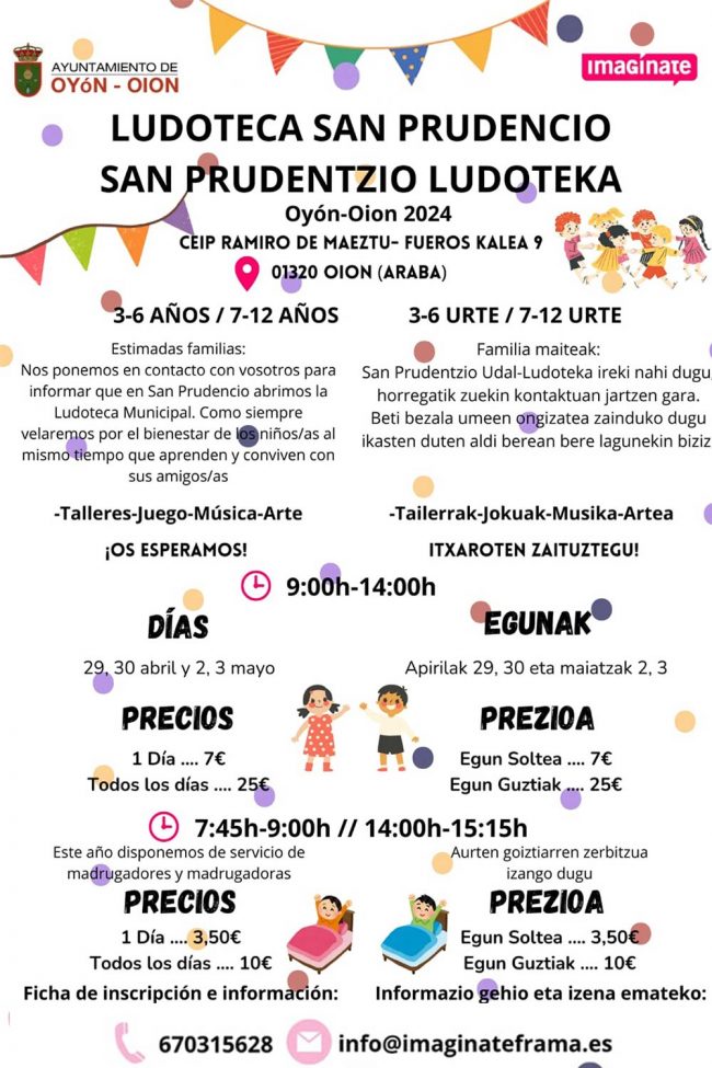 Ludoteca San Prudencio Oyón / Oion 2024 Fecha: días 29, 30 de abril y 2, 3 de mayo de 2024. Horario: de 9:00 a 14:00 h. Lugar: CEIP Ramiro de Maeztu, C/ Fueros nº9, Oyón / Oion . Edades: de 3 a 6 años y de 7 a 12 años. Precio 1 día: 7€ .…