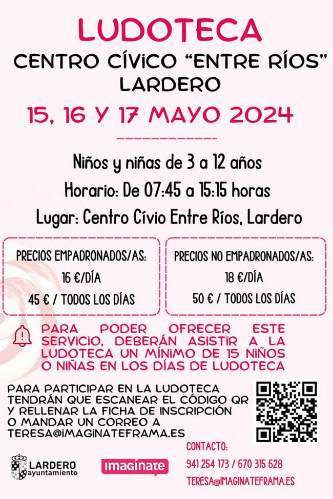 Ludoteca «Entre Ríos« 15, 16 y 17 de mayo de 2024 Fecha: días 15, 16 y 17 de mayo de 2024. Horario: de 7:45 a 15:15 h. Lugar: Centro Cívico «Entre Ríos», Plaza Entre Ríos de Lardero. Edades: de 3 a 12 años. Precio empadronados/as: 16€ al día. 45€ todos los días. Precio No empadronados/as:…