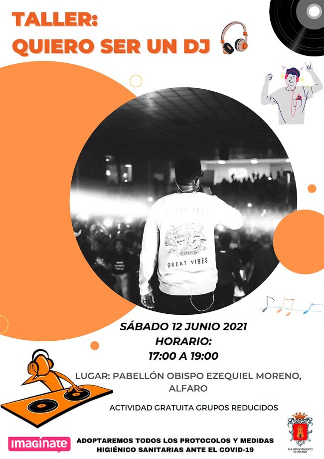 Taller quiero ser un DJ Taller «Quiero ser un DJ» que se impartirá en el Pabellón Obispo Ezequiel Moreno de Alfaro el sábado 12 de junio de 2021 de 17:00 a 19:00 horas. La actividad es gratuita y los grupos serán reducidos. Adoptaremos todos los protocolos y medidas higiénico-sanitarias ante el Covid-19. 1 DJ con…