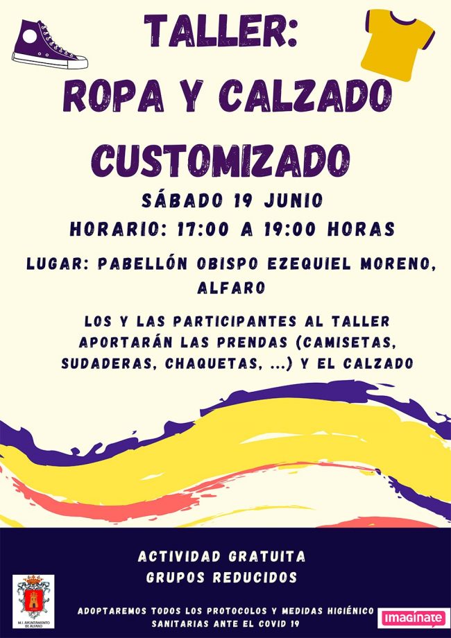 Taller ropa y calzado customizado Taller «Ropa y calzado customizado» que se impartirá en el Pabellón Obispo Ezequiel Moreno de Alfaro el sábado 19 de junio de 2021 de 17:00 a 19:00 horas. La actividad es gratuita y los grupos serán reducidos. Adoptaremos todos los protocolos y medidas higiénico-sanitarias ante el Covid-19. Los y las…
