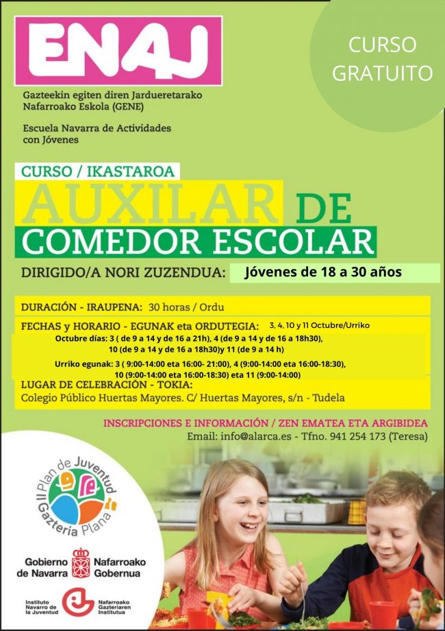 Curso GRATUITO de Auxiliar de Comedor Escolar en Tudela, dirigido a jóvenes de 18 a 30 años, realizado por Escuela Alarca.