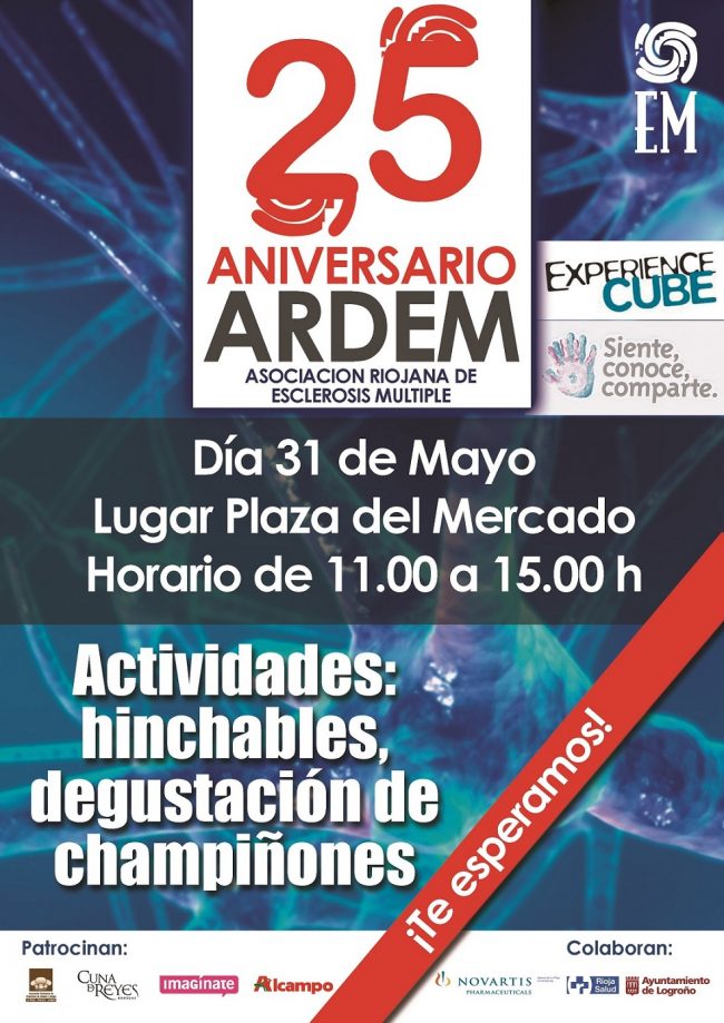 El pasado miércoles 27 de Mayo fue el el Día Mundial de la Esclerosis Múltiple. Este domingo Imagínate estará en la plaza del Mercado de 11.00 a 15.00 horas con la Asociación Riojana de Esclerosis Múltiple.(ARDEM) celebrando su aniversario. Habrá hinchables y degustación de champiñones.