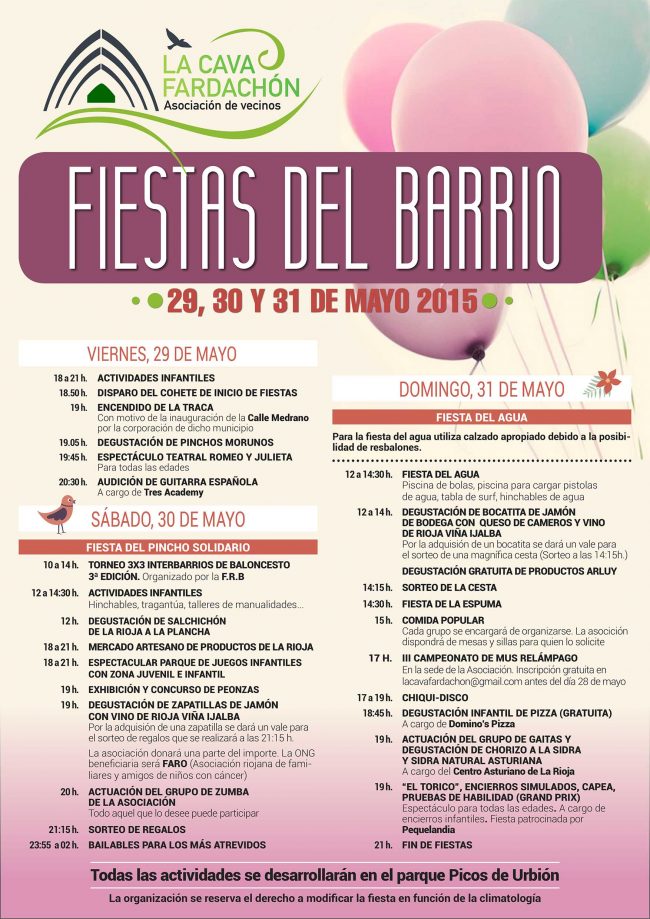 Esta tarde se disparará el cohete de las fiestas del barrio La Cava – Fardanchón. Estaremos todo el fin de semana en el parque Los Picos de Urbión Hoy viernes por la tarde con hinchables para los más pequeños y degustación de pinchos morunos y mañana sábado, en el mismo sitio volvemos con hinchables, globos, maquillajes…
