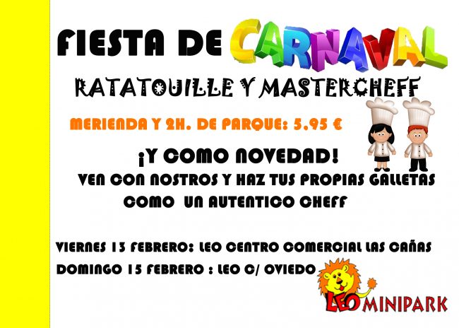 Ya llega carnaval!!!! Este año en Mínipark leo nos disfrazamos de Ratatouille y además de merendar y jugar con nosotros….te ofrecemos convertirte en cheff con un taller de cocina. Ven con tus amigos/as !!!